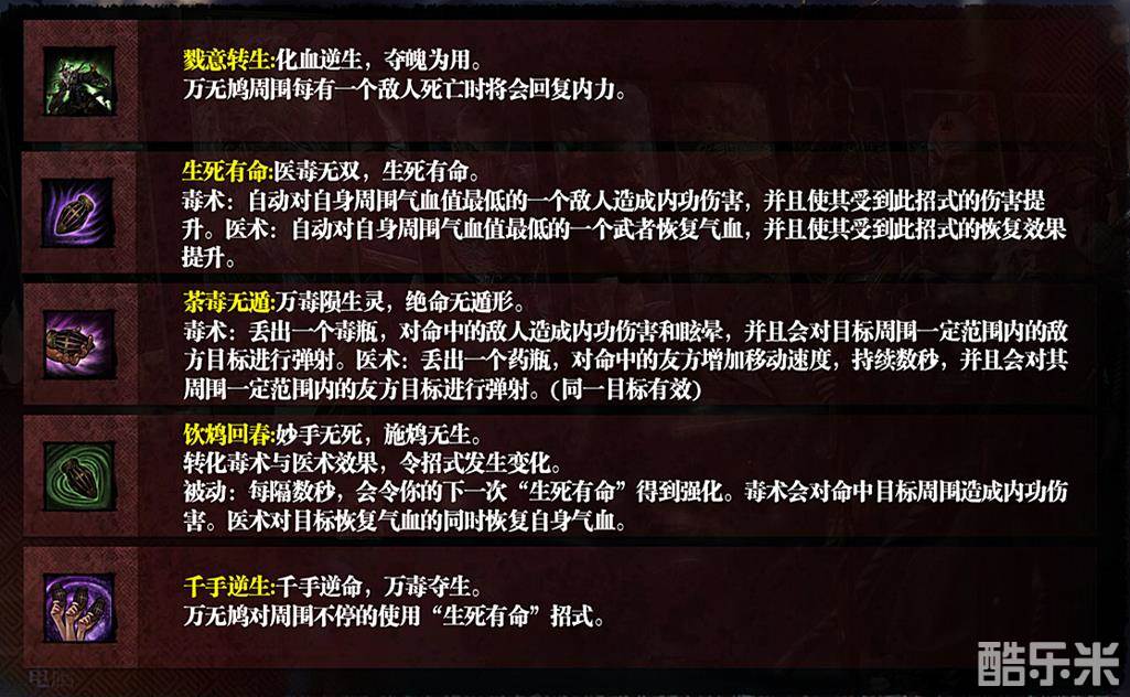 万无鸠拥有两种作战模式,可以随时切换成输出或治疗,天赋为周围每有敌人伤亡时可回复内力;招式1在输出状态时能对周围血量最低的敌方武者造成伤害,再次命中将提升伤害效果。治疗状态下则对周围血量最低的友方武者进行回复,再次命中将提升回复效果;招式2在输出状态时丢出一个毒瓶,对命中的敌人造成晕眩和伤害,可对目标附近的敌人进行弹射。治疗状态下则丢出一个药品,为命中的队友增加移动速度,可对目标附近的友方进行弹射;招式3可以切换作战模式,同时每隔一段时间给招式1带来增益,即输出状态时,毒液可对敌人进行溅射伤害,而治疗状态时,医治队友的同时可以治疗自己;而招式4能在短时间内对周身不断使用招式1,以达到快速收残血或急救的目的。