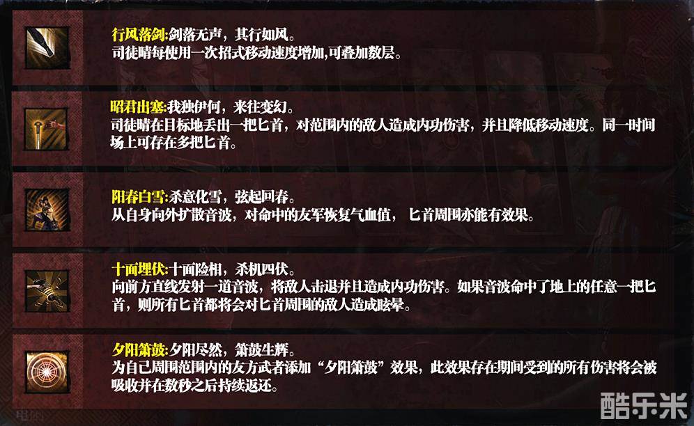 司徒晴属于远程内功辅助武者,行走江湖所背负的琵琶之中暗藏利器,见血封喉,武功之高不可小觑。司徒晴天赋行风落剑,施招后能增加移动速度;招式1昭君出塞,琵琶中匕首扔出,对范围敌人造成伤害并减速;招式2阳春白雪,对自身以及匕首附近友方进行治疗;招式3十面埋伏,可击退敌人造成伤害,沿途若有匕首则可附带晕眩;招式4夕阳箫鼓,将为周身友军添加气罩,短期内化解所有伤害,改为数秒后持续掉血。