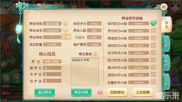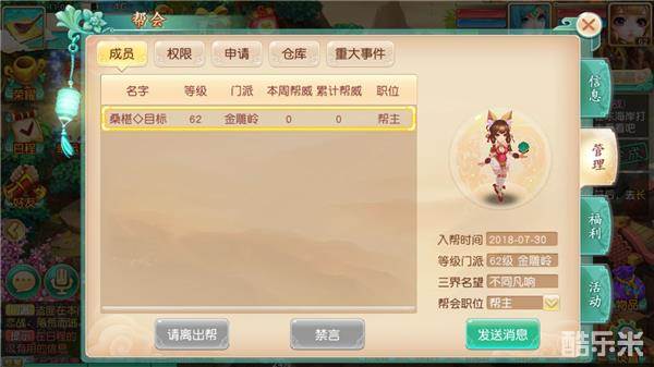 创建帮会之后,即可看到你的帮会界面啦。帮会界面分有信息,管理,福利,活动四大子界面。