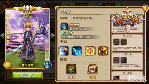 骁勇善战的亚瑟王传奇的一生留下不逊于诸神的傲人战绩和事迹,从拔出石中的圣剑开始,到率领圆桌骑士驰骋欧洲大陆,一路打下赫赫威名。战功显赫的亚瑟王以女儿身降临《盗梦英雄》西方诸神阵营,在游戏中亚瑟王一身黑铁铠甲,手持石中剑,回归英姿飒爽的青年形象。亚瑟王作为攻击型英雄在战场上向敌人冲锋突进,打断敌人队形,在造成大量伤害的同时提升生命和攻击力,务必坚定不屈的站在战场上,与队友共同迎接诸神之战的胜利曙光。