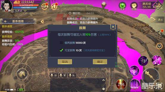 可使用经验丹,成倍经验加成;每次鼓舞可增加人物10%伤害(上限100%)