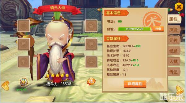 镇元大仙的英雄传记效果如图所示,六个英雄传记主要是提高镇元大仙的恢复能力,其伤害能力相较而言提升的幅度并不大。