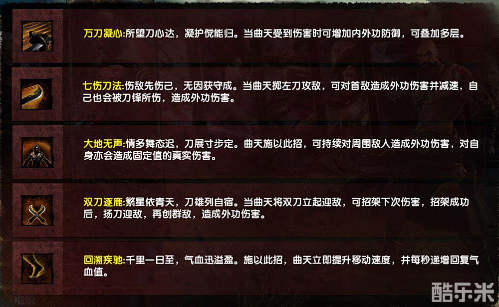 曲天的被动天赋以及大招为其提供了不错的生存和逃生能力,属于团战混乱制造者,可以在团战当中长时间的存在,但是由于乏力的控制导致其在团战中不能为队友提供有力的支持。在对线过程中,如果敌人为远程则需要躲在兵线之后吸收经验提升等级,等到有控制招式的队友配合通过1招式“七伤刀法”以及2招式“大地无声”进行消耗击杀;如果敌人为近战,曲天则可通过3招式“双刀逐鹿”的防守反击以及2招式“大地无声”与之对抗消耗,通过1招式“七伤刀法”的甩刀减速并且伤害进行击杀。由于曲天的2招式“大地无声”对自己也会造成伤害,故前期等级低或者装备没成型的时候尽量不要过多使用此招式,可在后期自身有效的抵御反伤之后频繁使用。