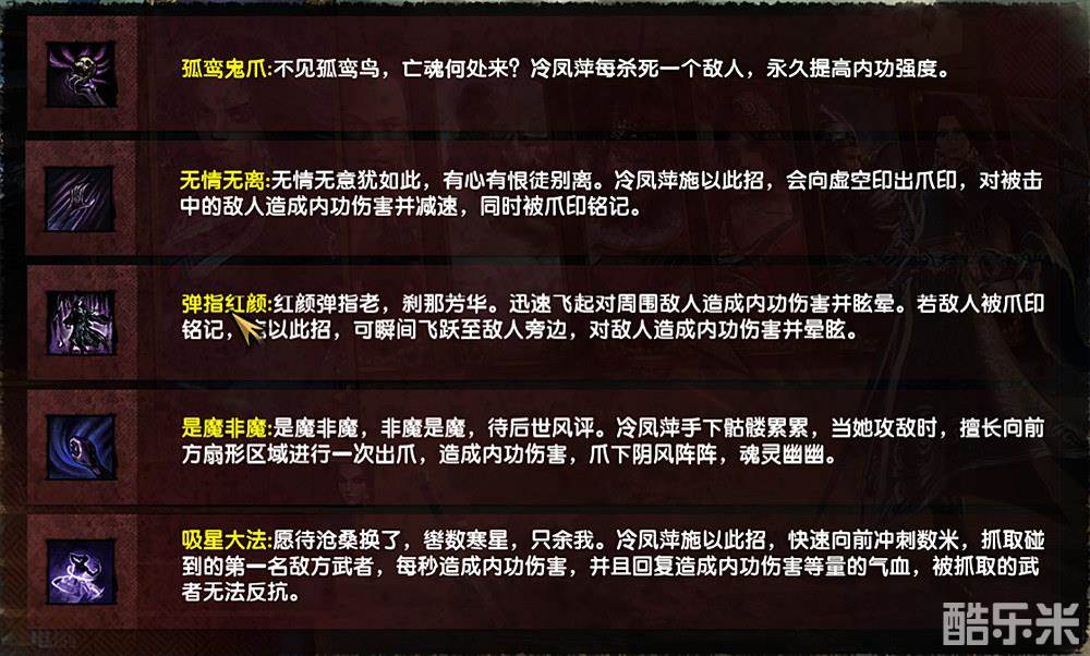 无情无离是一个单体招式,虽然有着很高的内功伤害加成但是前期仍然推荐只加一点,前期更多的是为了配合弹指红颜突进到敌人身边但是装备成型以后,这个招式是冷风萍主力输出招式之一。是魔非魔是冷风萍的核心输出招式,超短的冷却缩减在每次都能给敌人造成很高的伤害。吸星大法可以作为一个先手技能突进瞬间控制敌方武者,也可以在与敌方武者单挑时,当气血不足时给予敌人反手控制与伤害。在团战中冷风萍更适合利用自己的控制与高伤害,瞬间秒杀一名敌方输出或辅助武者,造成4V5的局面。