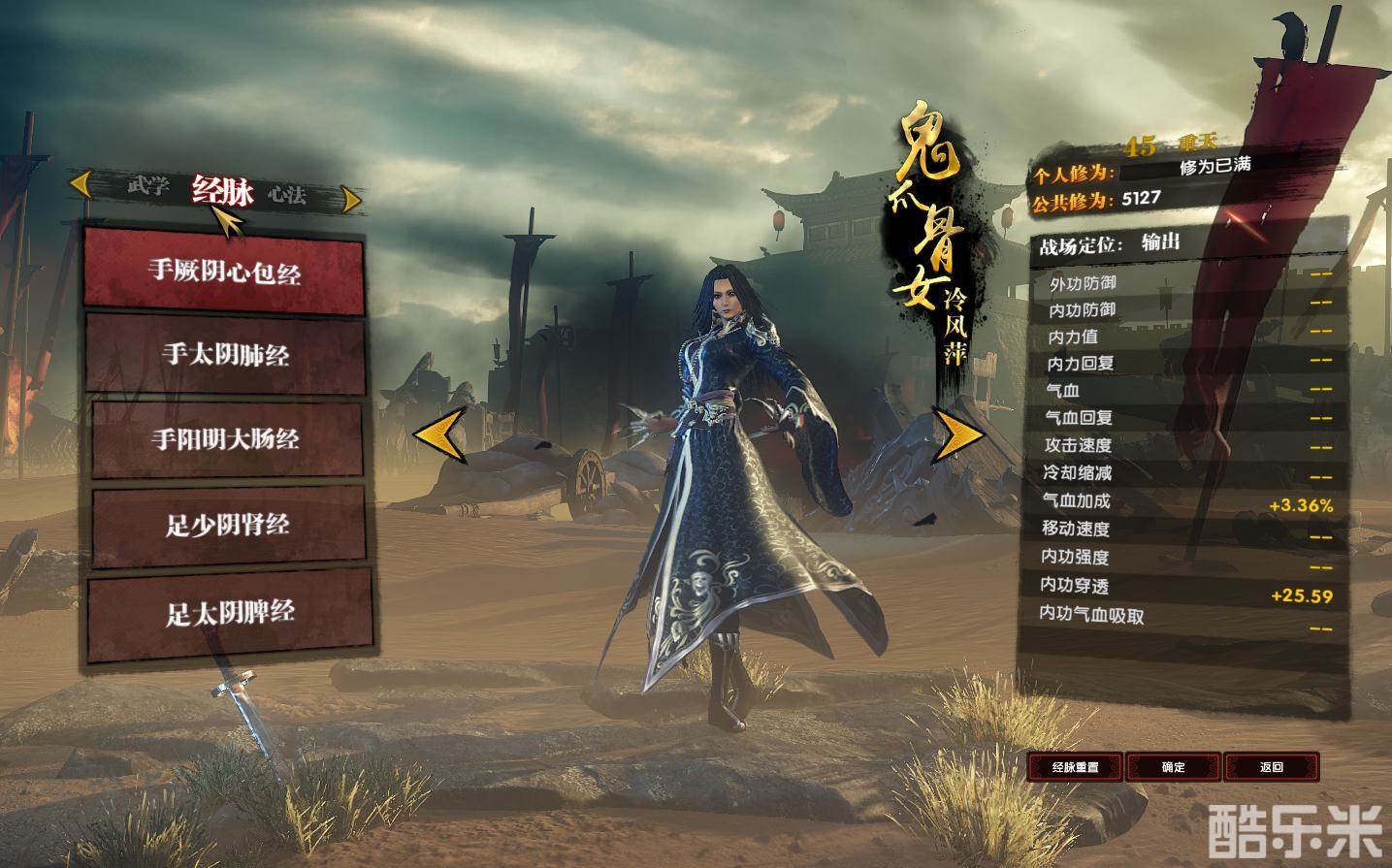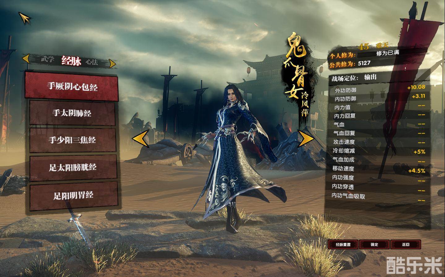 说明:冷风萍有一个后期非常强大的被动效果,故配合全内功穿透属性可以在游戏后期达到对武者的最大化伤害。黄色穴位使用气血加成提升一定生存能力。