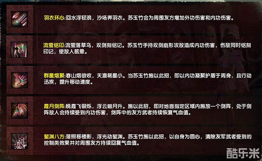 苏玉竹的天赋能够提升周身范围内武者的内外功伤害,效果不大,凝聚力不够;招式1适合与武者对战,扇形伤害且有晕眩效果;招式2为护盾能吸收伤害并可提速,是追击与保命合一的神技;招式3的剑阵具有群体伤害并能群体回复,且能远距离投掷,为苏玉竹的核心招式;招式4在团战时能够发挥巨大效用,关键时刻可以转危为安,扭转败局。苏玉竹易上手且能够多样化发展,适合新手使用,她本身拥有控制招式、远程招式、护盾招式、辅助招式,可攻可守可回血,也拥有良好的击杀本领,能力全面,操作简单。容易让新手明白各类招式的用法,从而逐渐过渡成为专业的近战、远程、肉盾、奶妈。