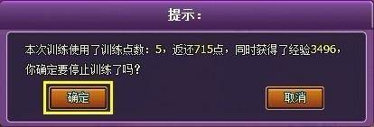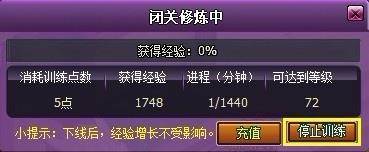 离线挂机状态可以打断,只要点击地面,就会弹出目前离线挂机的状态栏,点击停止训练再点击确定即可。同时还会尚未用完的训练点数。