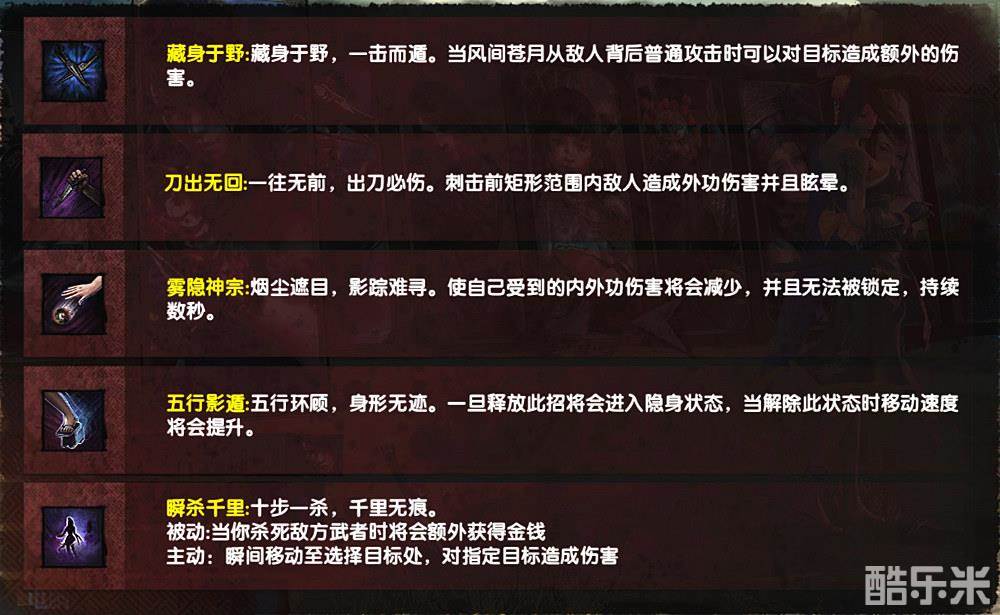 风间苍月属于近战外功输出武者,通晓五行遁术,擅长行刺暗杀,天赋“背刺”,在敌人身后攻击将有额外伤害加成;招式1“刀出无回”具有晕眩效果,招式2“雾隐神宗”将减少自身受到的伤害,且使得自己无法被对手的招式锁定;招式3“五行影遁”可使得自己隐身,现身时移动速度将短暂提升,适用于刺杀和脱逃;招式4“瞬杀千里”能够瞬移击杀,冷却时间较快,且有被动效果使得击杀武者所获得的金钱增加一倍,依靠此特性能够快速攒钱出装。