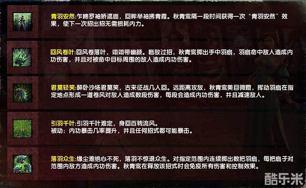 秋青鸾战场定位为远程输出武者,天赋“青羽安然”每隔12秒能提供一次无消耗出招,令其成为以招式攻击为主的武者;招式1“回风卷叶”为直线条形伤害,有溅射效果;招式2“君莫轻笑”为投掷圆形AOE范围伤害,且带有减速,是秋青鸾最出色的招式;招式3“引羽千叶”是提升暴击几率的被动招式,只需升级无需施放;而大招“落羽众生”是专门针对单个武者的疯狂5连击,具有秒杀残血与脆皮的作用。