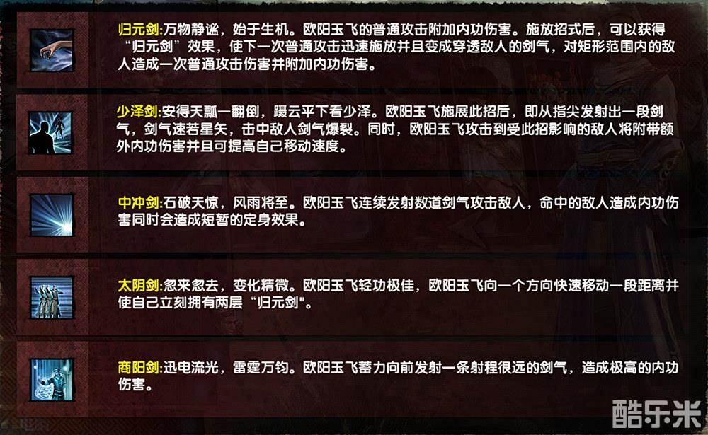 欧阳玉飞身怀天下两大奇功之一的六脉神剑,风度翩翩,能以气御剑,杀人于无形。战场定位为远程内功输出武者,他的天赋“归元剑”拥有点石成金的本领,搭配4招剑气能够将普攻伤害发挥到淋漓尽致。大招“商阳剑”为纯输出技能,而招式1“少泽剑”、招式2“中冲剑”、招式3“太阴剑”分别有提速、定身、位移的效果,促使欧阳玉飞荣升为团队压制敌方成长的新杀手锏。
