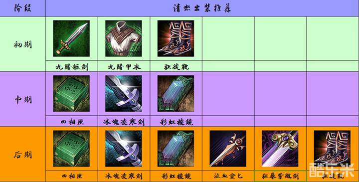 清怒属于近战外功输出武者,初期出门装为九阳短剑、九阳甲衣、狂徒靴;中期核心装为四相匣、冰魄寒光剑(凌寒)、彩虹棱镜;后期六神装为四相匣、冰魄寒光剑(凌寒)、彩虹棱镜、泣血金匕、紫微剑(狂暴)、狂徒靴。