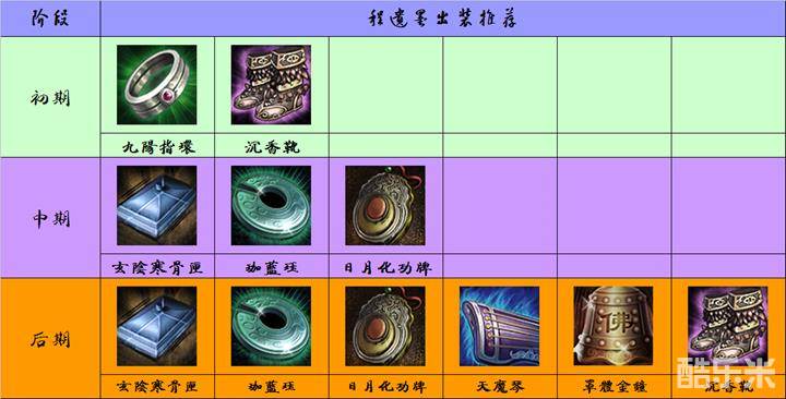 程遗墨属于远程内功辅助武者,初期出门装为九阳指环、沉香靴;中期核心装为玄阴寒玉匣(寒骨)、珈蓝珏、日月化功牌;后期六神装为玄阴寒玉匣(寒骨)、珈蓝珏、日月化功牌、天魔琴、罩体金钟、沉香靴。