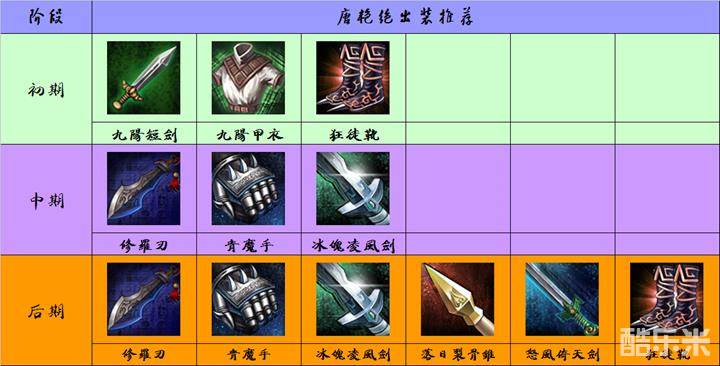 唐艳绝属于远程外功输出武者,初期出门装为九阳短剑、九阳甲衣、狂徒靴;中期核心装为修罗刃、青魔手、冰魄寒光剑(凌风);后期六神装为修罗刃、青魔手、冰魄寒光剑(凌风)、落日锥(裂骨)、倚天剑(怒风)、狂徒靴。