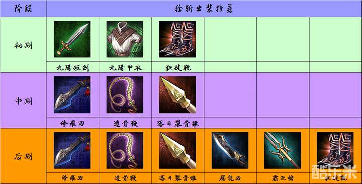 徐斩属于近战外功输出武者,初期出门装为九阳短剑、九阳甲衣、狂徒靴;中期核心装为修罗刃、透骨鞭、落日锥(裂骨);后期六神装为修罗刃、透骨鞭、落日锥(裂骨)、屠龙刀、霸王枪、狂徒靴。