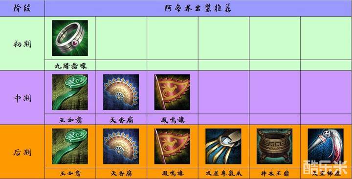 阿各林属于近战内功输出武者,初期出门装为九阳指环;中期核心装为玉如意、天香扇、凤鸣旗;后期六神装为玉如意、天香扇、凤鸣旗、吸星爪(夺气)、神木王鼎、天罡拂尘。