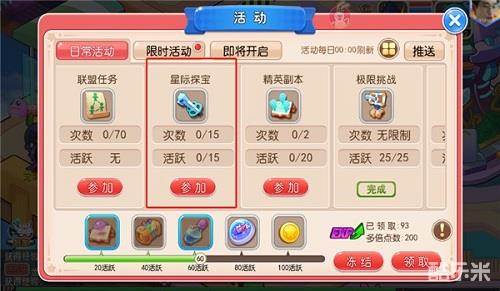 星际探宝的参加方式在每日活动的日常活动中,直接点击参加就可以自动完成战斗15次。非常的简单哦!由于星际探宝的怪物十分有限,并且打这个模式的玩家又很多,建议玩家组满一队人后在进入副本,给自己谋取更多的福利。