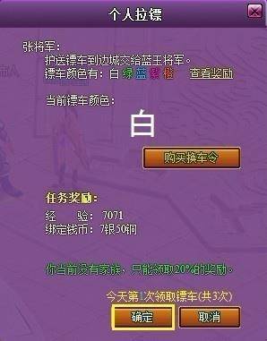 (2)镖车颜色分为白、绿、蓝、紫、橙五种,运镖奖励按镖车颜色依次增长(其中白色镖车奖励很少,橙色镖车奖励很多)。玩家可以使用换车令来改变镖车的颜色,获得自己满意的镖车颜色后再点击『确定』开始运镖。