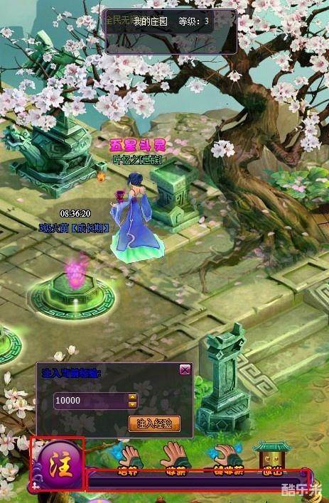 点击【注】字按钮,注入角色经验,当经验条注满的时候,你的庄园就可以升级了。