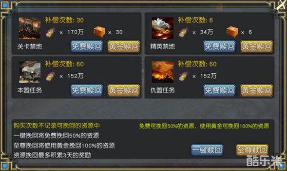 当玩家忘记了游戏内的某些活动时,系统将贴心的为玩家保存最多3天的活动奖励。玩家上线后,可选择免费赎回各项奖励的50%,也可花费少量黄金进行100%奖励赎回。