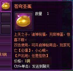 现在游戏中,击杀任何怪物,都有机会掉落道具“苍穹圣蛋”。苍穹圣蛋是开启神秘商店的途径,当玩家获取苍穹圣蛋后,会获得系统的祝福广播,让大家共同分享好运的喜悦。
