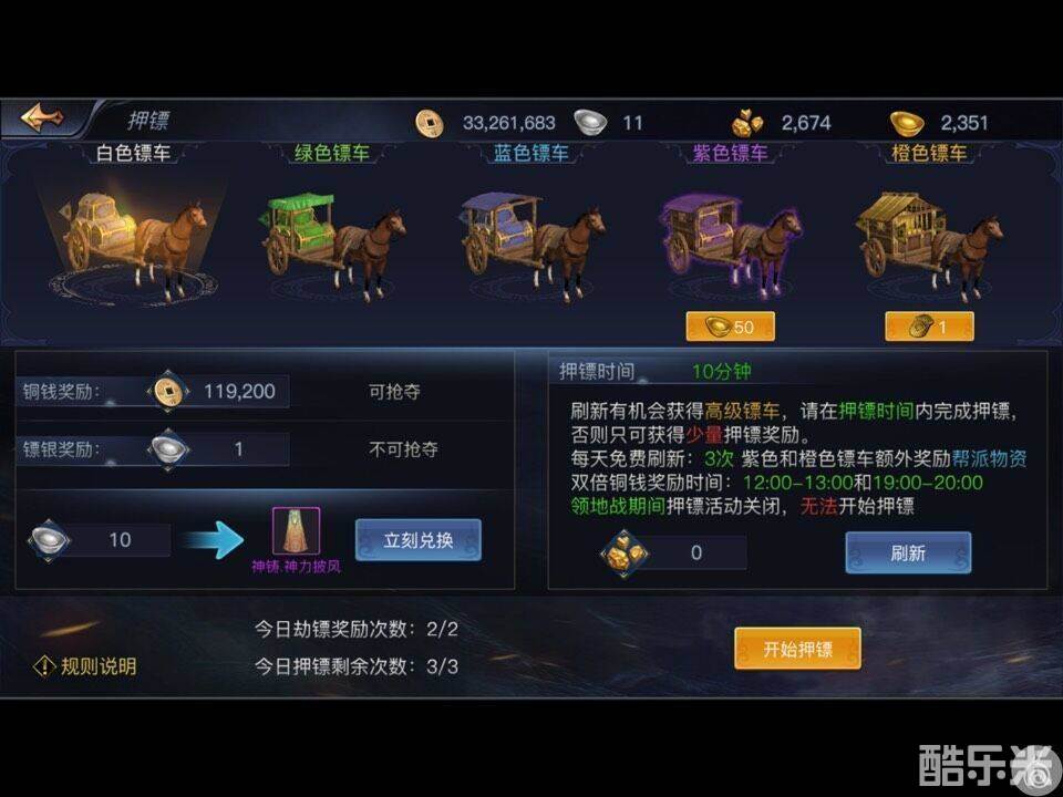 在青石山脉进行“镖车护送”。每天的12:00-13:00和19:00到20:00开始押镖可以获得双倍铜钱奖励。运送的镖车会被敌对势力的玩家攻击,前往劫镖会传送至对方运镖线路旁。劫镖可以获得50%的铜钱奖励,镖车剩余的铜钱为75%。押镖者在镖车旁边时镖车处于保护状态,不可攻击低于自身等级100级的镖车。