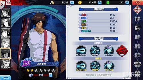 茶镀泰虎作为《死神》中的主人公之一,黑崎一护的挚友,拥有强大的体魄和实力,具备“巨人的右臂”。笔者最喜欢的是他温和的性情,虽然话不多,但是为朋友挺身而战的情谊打动了无数粉丝。在千年血战篇中,茶镀泰虎和一护、织姬等人前往灵王宫将雨龙带回的情节让笔者彻底转粉。按原作中的设定,在《死神激斗》手游中,茶镀泰虎的类型是“力”。