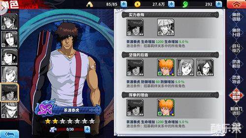 先来看茶镀泰虎的“彩蛋”——灵魂羁绊,这个玩法的设定明显可以看出是根据原作角色人际关系来的,非常有诚意。原作中,国中时期茶镀曾被不良少年找麻烦,一护替他解围,随后两人成为挚友,约定“为了对方而挥拳”,这段纯真的友谊羁绊,在游戏中也被记录为羁绊之“挥拳的理由”,招募一护和茶镀就可激活,为角色提供属性加成。
