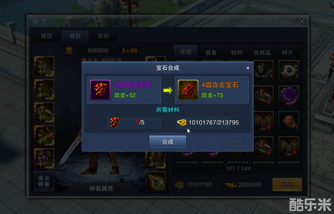 合成消耗:宝石(5合1)、铜币合成成功率:100%合成限制:等级限制