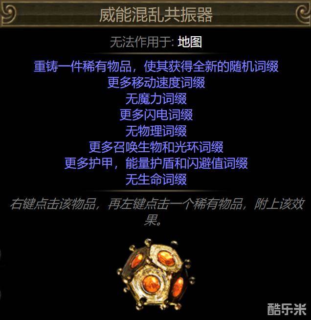下图中所展示的物品名字为“威能混乱共振器”,拥有该通货,你就可以将重置一件装备的属性词缀,重置后的装备必定不带有魔力、生命、物理类型的词缀,且会有更高的概率获得移速、闪电、召唤生物词缀!