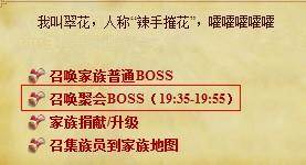 活动期间,家族地图内的“家族BOSS”NPC有了新的选项——召唤聚会BOSS。聚会BOSS只能在家族聚会期间,由族长或副族长召唤,击杀BOSS后可获得各种宝石、道具、钱币,快召集你的族员一起消灭它们吧!