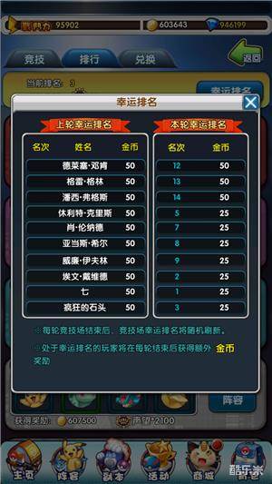 在竞技场第一个名的强大攻势下,你是否感觉到看不到希望呢?进化吧皮卡丘考虑到竞技场排名的单调性,增加幸运排名,幸运排名和实力本身有一定联系,但是排名会在一轮竞技结束后,随机排名,根据排名名次奖励额外的金币。