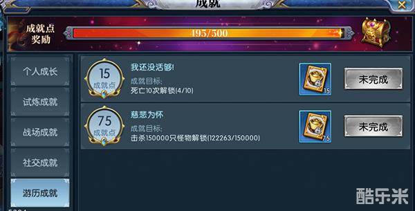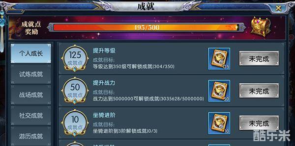 成就类型分为个人成长,试炼成就,战场成就,社交成就,游历成就,不同类型都有每个类型的成就目标,达到目标就可以领取绑定元宝