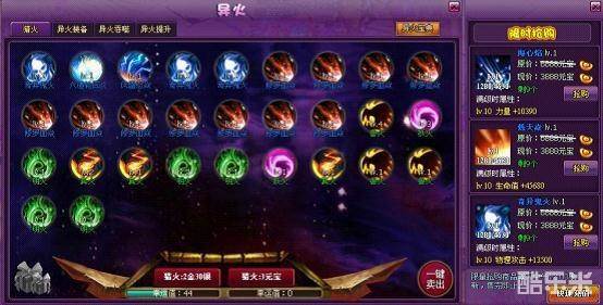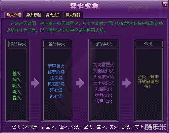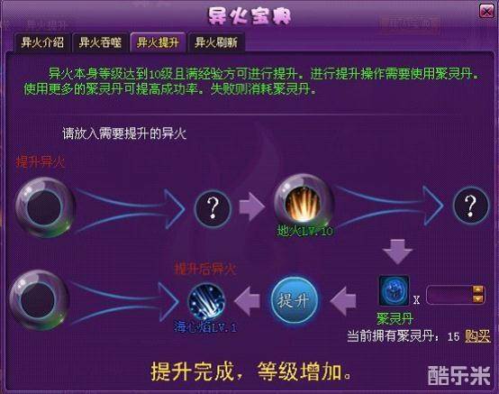 紫色的异火只能通过蓝品异火提升等级达到10级进阶获得。同样也会大大提升玩家各种属性。异火需要进行吞噬其他异火才会获得经验升级。吞噬异火不能吞噬比主主体等级高的异火。当异火达到10级后可以进行提升。