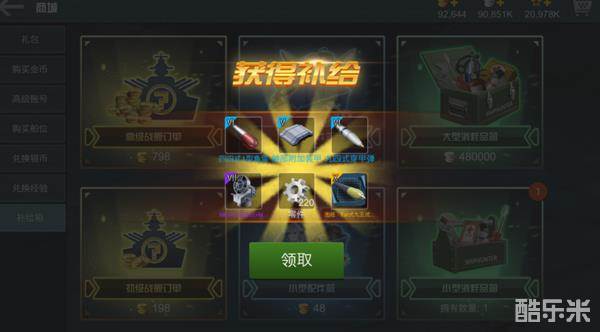 点进商城,选择左侧补给箱标签就可以看到配件箱了,让我们随便买一些看看配件到底是什么吧。