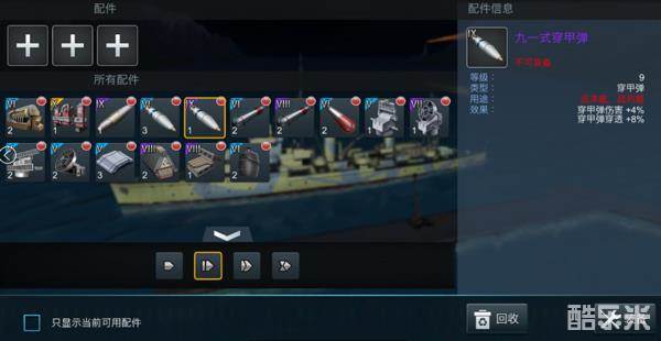 让我们赶紧回到配件界面吧。小编一眼就看中了知名的九一式穿甲弹,其等级为9级,品质为紫色,效果是增加穿甲弹伤害4%和穿甲弹的穿透8%。