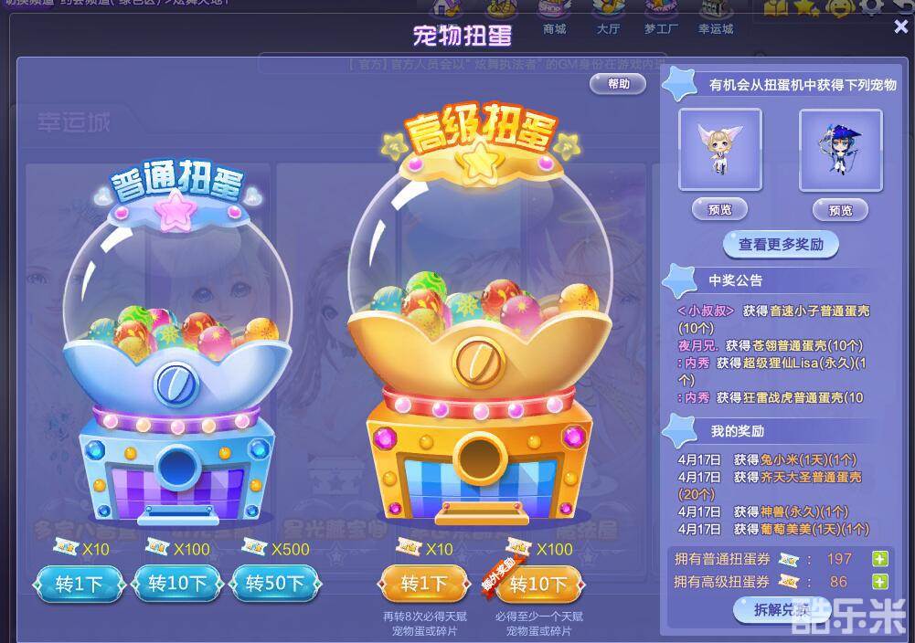 活动时间内,扭蛋系统下高级扭蛋的转一下和转十下整蛋的抽奖概率双倍,其中包括极品莲小仙(永久) 、超级萌萌(合体)、极品苍翎(永久)、极品石莲圣(永久)、极品音速小子(永久)、极品蒲露婀梓(永久)、极品萌动月灵(永久)、极品齐天大圣(永久)、极品紫烟仙狐(永久)、极品狂雷战虎(永久)。