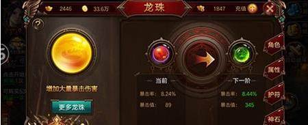 龙珠:提供大量暴击率、暴击伤害增益。在商城、竞技场、击杀BOSS中可获得龙珠碎片用来升级龙珠,终极可得龙神之心。