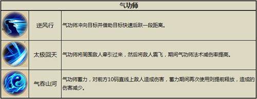 出招化息成形不拘一格,气功师被称为一代宗师。气功又称炁功,是神秘东方强身健体的锻炼方法。其技能中的“太极回天”可以将周围敌人牵引过来,然后将敌人震飞,以内劲伤人,属于法术攻击;“气吞山河”罡气外放,对前方直线上敌人造成伤害,神似冲击波哦!
