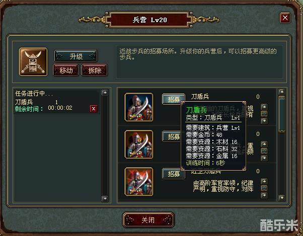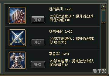 A:在军事中心当中可以研究兵种的科技,能够给兵种附加攻击力、生命上限和防御。高等级的兵种需要升级此类科技之后才能招募。如下图所示,近战集训升至20级后,就可以提升近战兵种生命值140,兵种科技等级越高,加成越多。