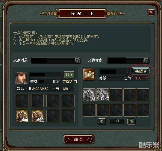 在挑战界面选择“补充兵力”会出现如下图所示的界面,在交换对象处可以选择自己存放士兵的城堡或营寨,在点选荣耀令即可使用“荣耀之门调兵令”来对部队进行补充。
