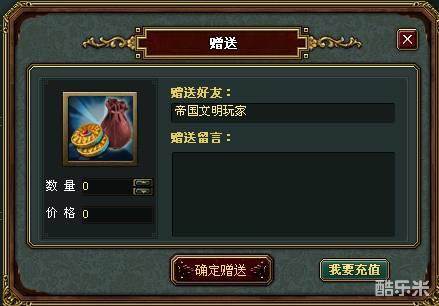 在赠送面板中,会让您填写需要赠送的对象(注意这里填写对方的角色名,不要填错哦)以及赠送留言。然后选择下同一种道具需赠送的数量,对应的价格就会显现出来,在确认价格后,点击“确认赠送”,则扣除相应的帝国币数量,并成功赠送给对方道具,对方将会收到一封邮件,需要在邮件中收取道具。