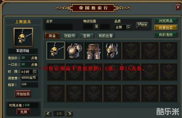 如果玩家有闲置的装备或者技能书,可通过拍卖行将装备或者技能书出售给其他玩家。(已获得的商城道具是无法拍卖的)