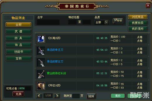 根据物品的类型可分为武器类、防具类、饰品类、技能书、宝物类。玩家可根据自己的需要进行分类选择购买,也可以输入物品关键词、等级范围、品质进行精确搜索拍卖物品。