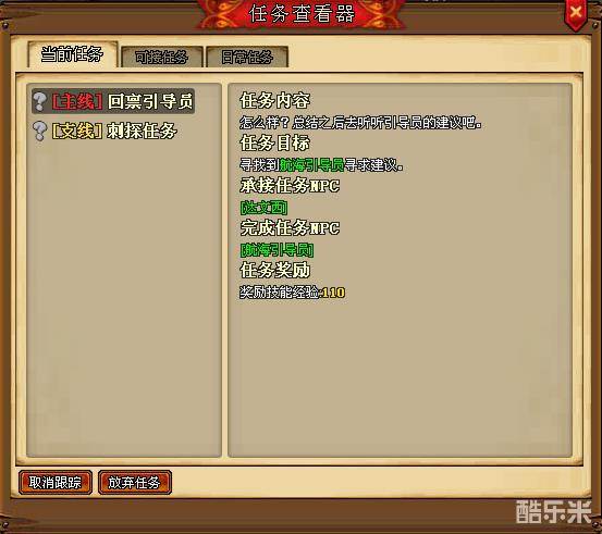 在场景NPC处承接任务,承接任务之后,可以在任务面板里面查看信息,同时也可以在任务面板放弃任务。