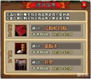 玩家可以通过点击界面上方的流行信息按钮( ),随时查看游戏中发布的商品流行信息。按照流行信息上面的货物来进行贸易,玩家能获取比以往更加多的利润。