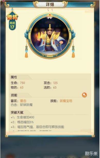托塔天王是一个17资质的橙色伙伴,普通攻击能够对前排敌人造成伤害。技能方面,能够对全体范围的敌人造成伤害,附带夺取敌人防御的效果,能够大大提升己方队伍对敌人造成的输出。如果说夺取的防御能够加在托塔天王自身身上的话,还能够进一步提升托塔天王的肉度,这个还是很不错的,不过有待实践考证。合击技能上能够对随机三名敌人造成伤害,并且概率流血,同时降低其造成的伤害,能够提升己方输出和影响敌人输出。