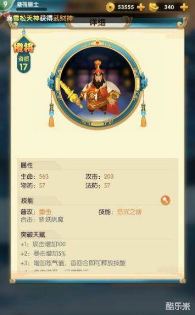 武财神是一个17资质的橙色伙伴,普通攻击对前排单体造成伤害。技能方面,能够对随机3名敌人造成伤害,范围还是不错的。并且大概率造成流血效果,有着一定的持续伤害能力。附带让敌人造成的伤害降低效果,还能够有效的影响敌人的伤害输出,变相的也是提升了己方防御能力,不管是在副本推图还是竞技PK中都非常实用。合击技能上能够进一步提升造成流血效果的概率,还是很不错的。