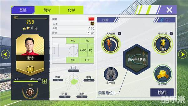 首先每个球员都有其五围属性,分别是射门、传球、带球、拦截和抢断(门将除外),每项属性影响什么相信大家从字面意思就能理解了。球员升级会提升五围,因此游戏的前期,升级球员提升战力,无疑是最快通过主线的手段。