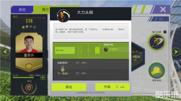 游戏进行到中期的时候,我们就要考虑技能的配合了。如下图所示,球员董学升的身高比较出众,而自身又有大力头槌的技能,而这技能需要接下底传中、任意球大师或角球大师才能触发,因此在组建阵容的时候,可以多安排一下拥有这类技能的选手,才能发挥董学升大力头锤的威力。