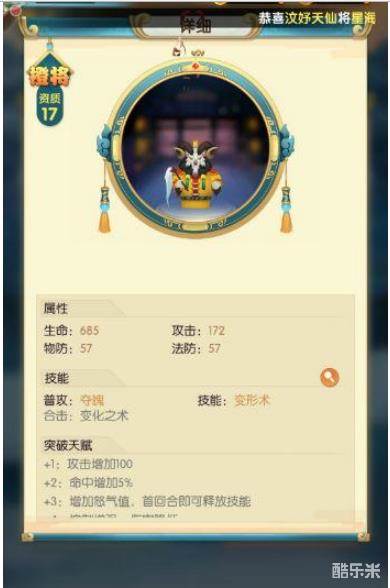羊力大仙是一个17资质的橙色伙伴,普通攻击能够对前排单体造成一定伤害。技能方面,能够对范围敌人造成伤害,并且附带变羊效果,有一定的控制能力。不过其几率实在是惨不忍睹,并且持续时间只有1一回合,实用性和稳定性都不是很强。合击技能上能够稍微提升一下变羊的概率,不过几率同样不是很高,运气成分比较重要。